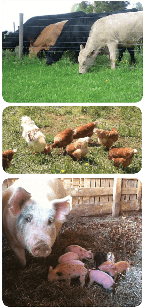 Our poultry and pigs are raised with plenty of space to roam and display their natural behaviors. Any feed they receive is soy-free, organically grown grain.